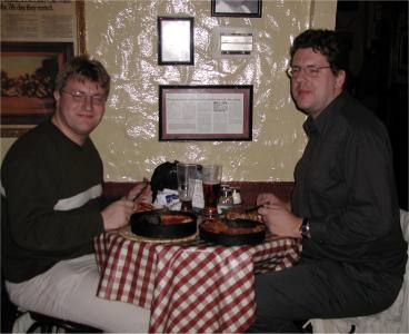 Na vijfen eerst wat uitgerust, geCNN-electioned en bepaald wat we gingen doen. Michael had de Pizzeria Uno gezien, home of the Chicago Pizza. Helaas, erg slecht weer buiten, we schuilen dus maar in het eerste de beste winkelcentrum. Wat onnodige handigheden bekeken bij Brookstone's etc en daarna de weg door de regen overgestoken om bij Borders de collectie Lonely Planets uit te breiden. Sydney (10 maanden kadootje van Eveline) en de South Pacific worden aan de collectie toegevoegd. Ondertussen een stukje droger buiten en dus maar richting Pizzeria Uno. Ook deze plek stond in de Lonely Planet en is (dus?) erg vol.