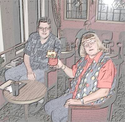 Koffie drinken in een echte Engelse tea room. Echte Engelse koffie, dus niet te drinken.
